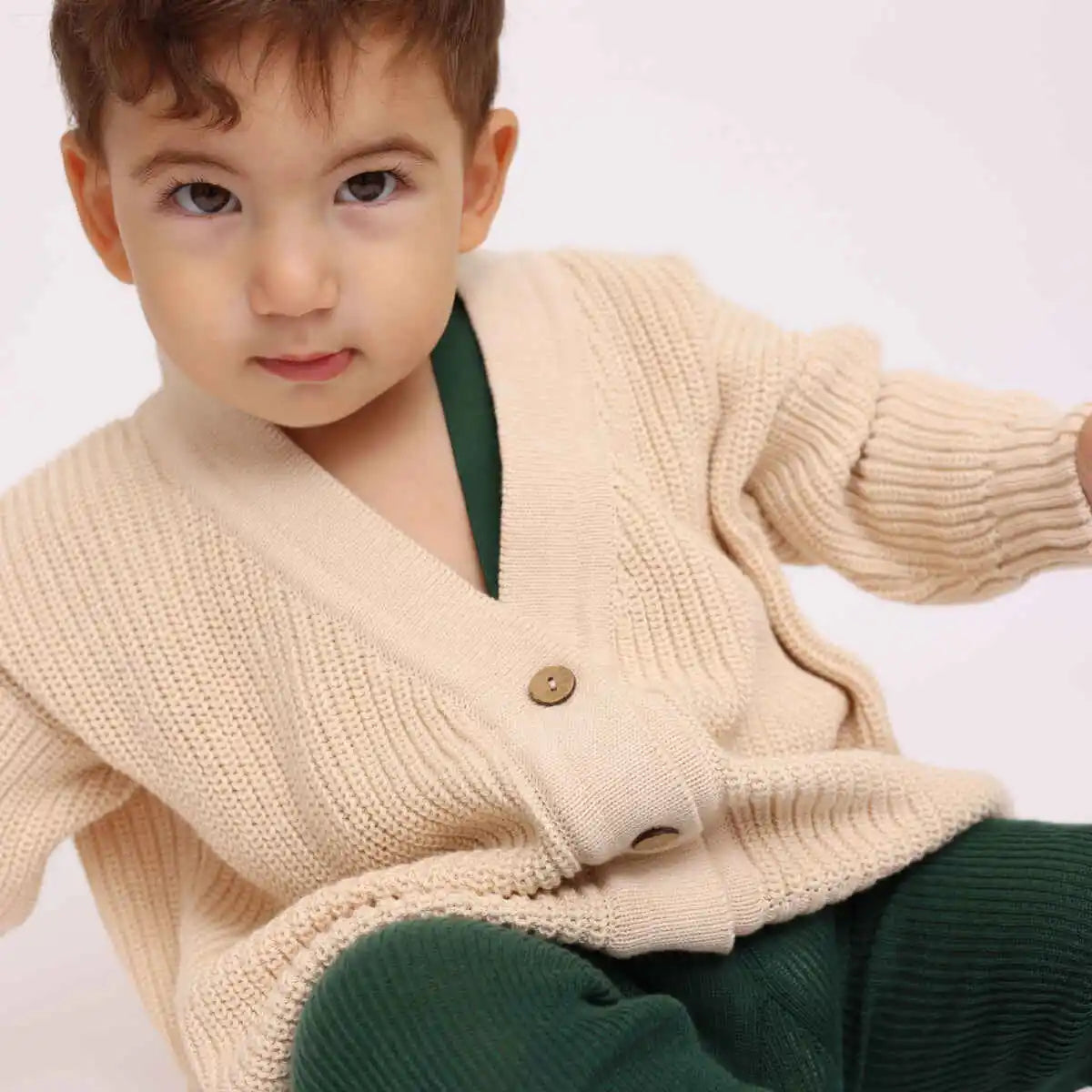 Ontdek deze knusse toevoeging aan de garderobe van je baby of kindje: een heerlijk zacht gebreid kindervest in een subtiele natuurlijke kleur.