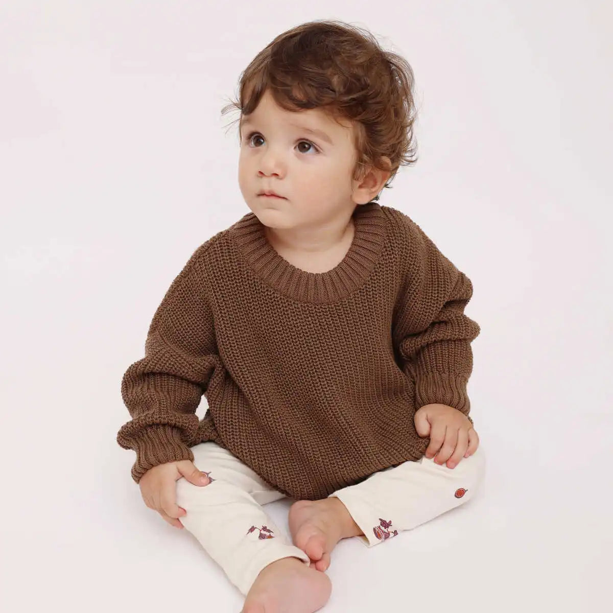 Door de neutrale chocoladekleur kun je deze gebreide kindertrui eindeloos blijven combineren met andere kinderkleding. De sweater voor baby's en kinderen is ervoor gemaakt om mee te groeien, wat zorgt voor een lange levensduur.