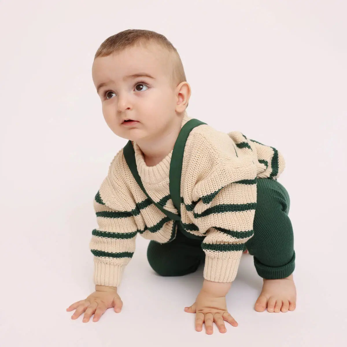 Door de subtiele, natuurlijke kleur met donkergroene strepen zul je lang plezier hebben van deze kindertrui. Dit kledingstuk is makkelijk te combineren met andere kinderkleding.