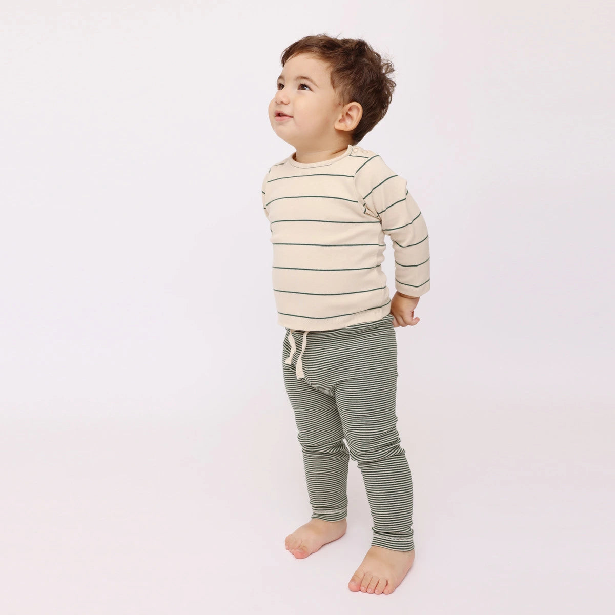 Gun je baby of kindje het plezier om lekker comfortabel en speels te kunnen bewegen met onze donkergroene gestreepte legging.