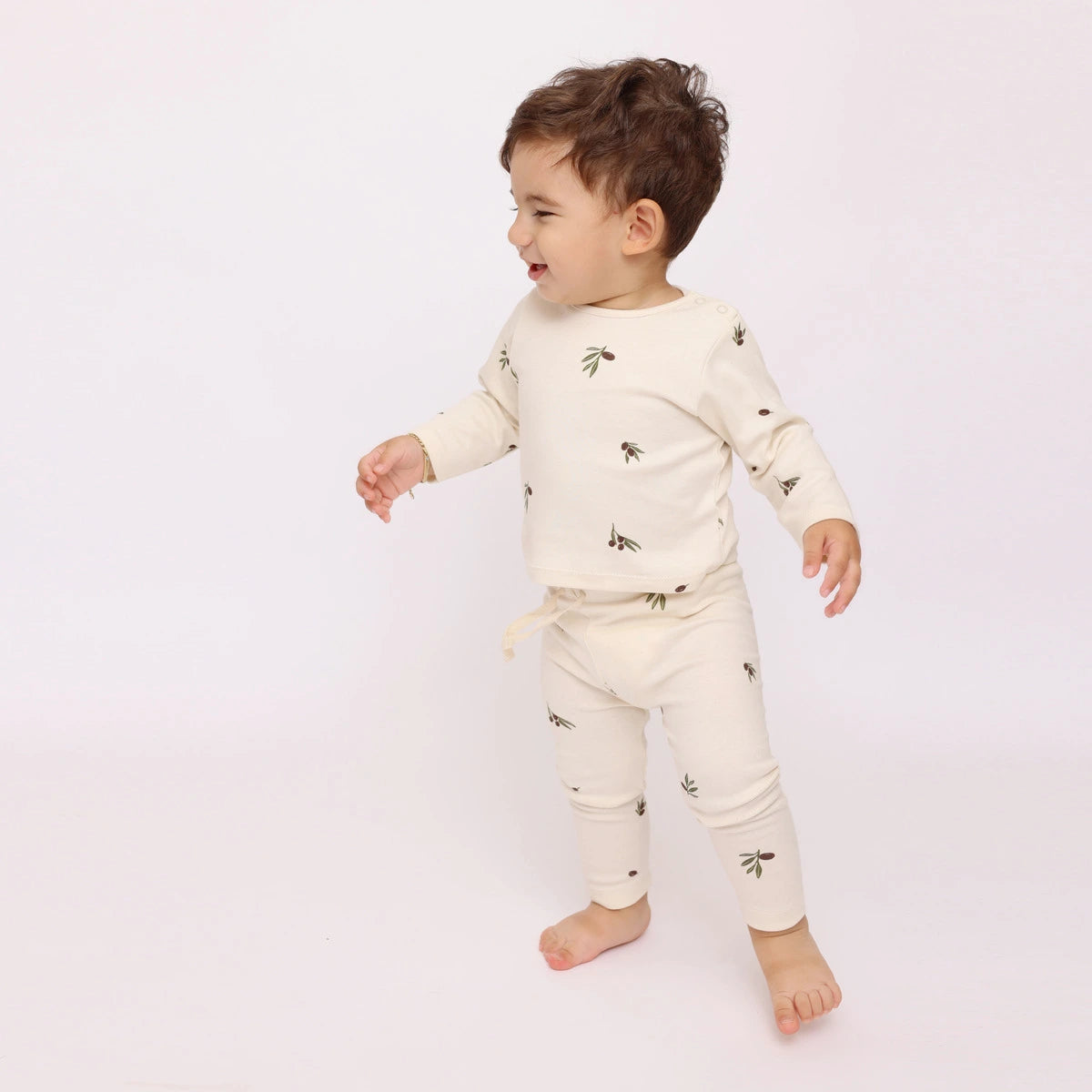 Ontdek onze duurzame, vrolijke leggings van 100% biologisch katoen met olijvenprint.